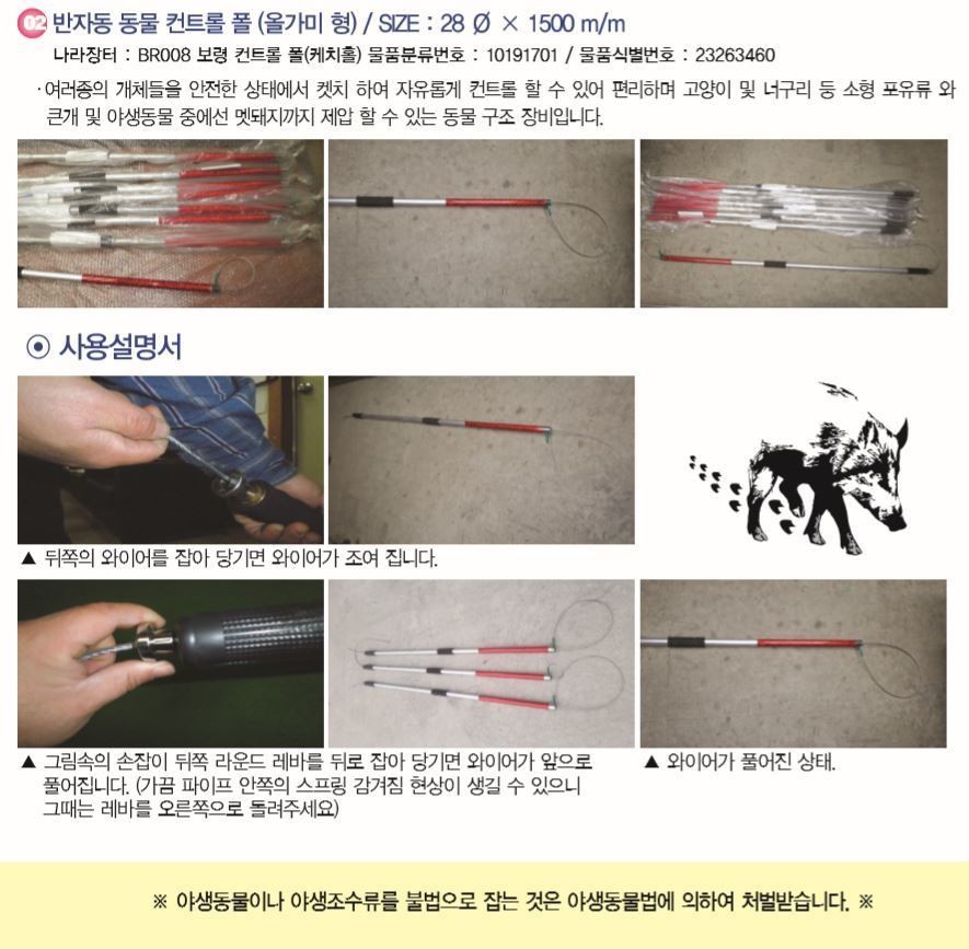와이어를 통해 동물을 제압하여 컨트롤 할 수 있는 생포기구로서 고양이, 너구리, 들개, 멧돼지 등 다양한 동물에 사용이 가능합니다.